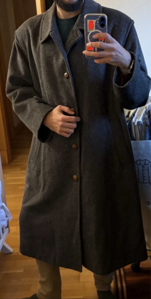 Pero me quedaba muy ancho de pecho y hombros y sobre todo me llegaba casi hasta los tobillos. A juzgar por el corte parecía el clásico oversized italiano de los 80 y 90. Y no me favorecía ese fit. Parecía un niño que le había cogido el abrigo a su padre.